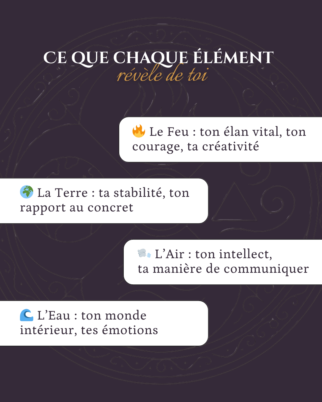 🔥 21 publications « Les 4 éléments astrologiques ». Pour faire découvrir la symbolique du Feu, de la Terre, de l’Air et de l’Eau, leur impact dans un thème natal, et comment identifier son élément dominant.