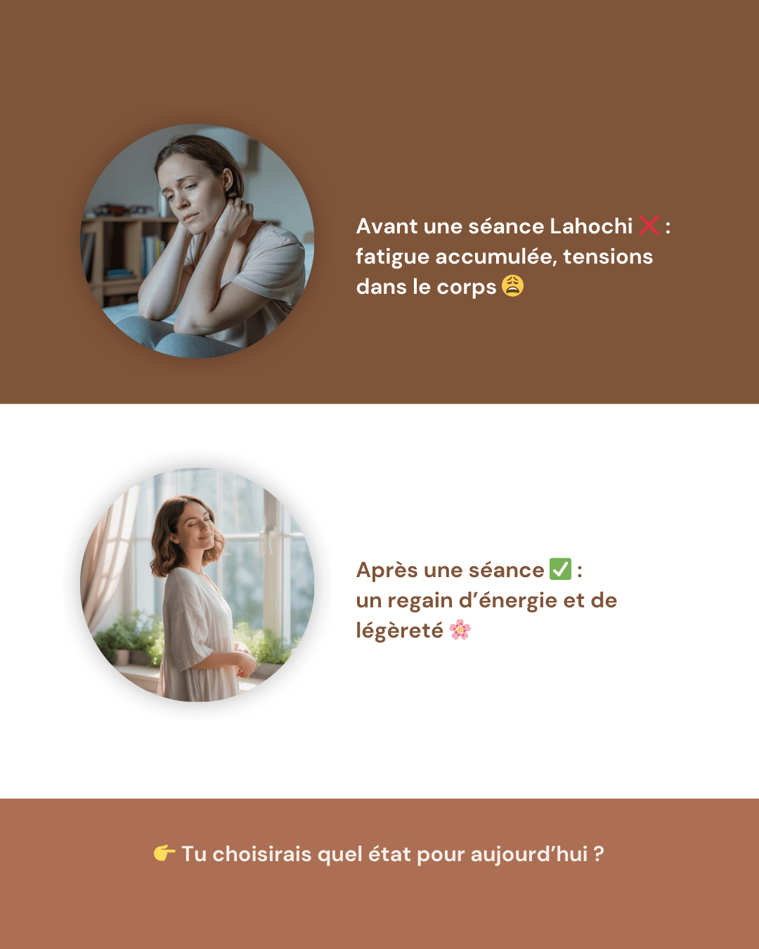 Pour mettre en lumière les effets du Lahochi sur le corps, l’esprit et les émotions : détente profonde, réduction du stress, meilleure circulation énergétique, vitalité retrouvée, etc.