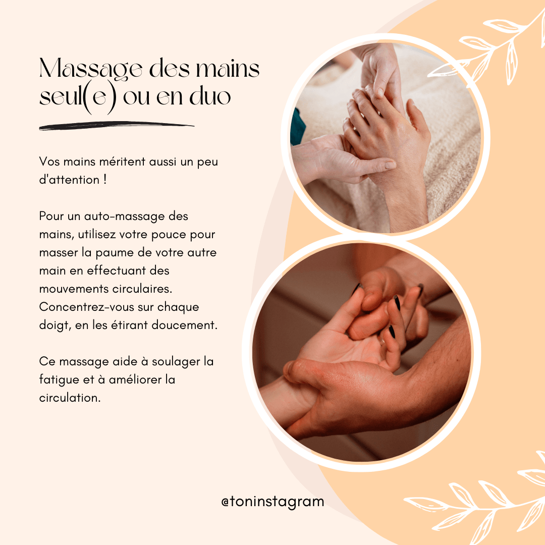 17 publications "Réflexologie" : explique les différentes formes de réflexologie (plantaire, palmaire, faciale…) pour guider ton audience vers cette technique de bien-être.