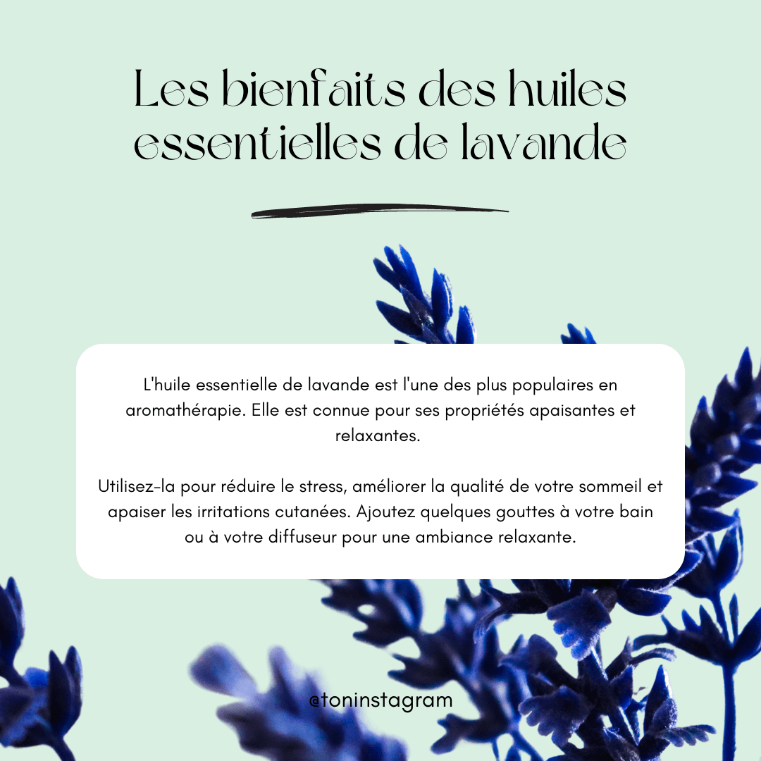 17 publications "Huiles essentielles" : éduque ton audience sur les bienfaits des huiles essentielles comme la lavande, le tea tree ou l’Ylang-Ylang, pour un bien-être naturel.