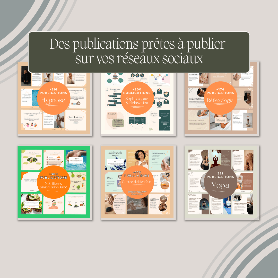 Ce pack de 376 publications prêtes à l’emploi est conçu pour t’aider à gagner du temps, à informer et inspirer ton audience, et à attirer de nouveaux clients en mettant en avant les bienfaits des massages et des soins.