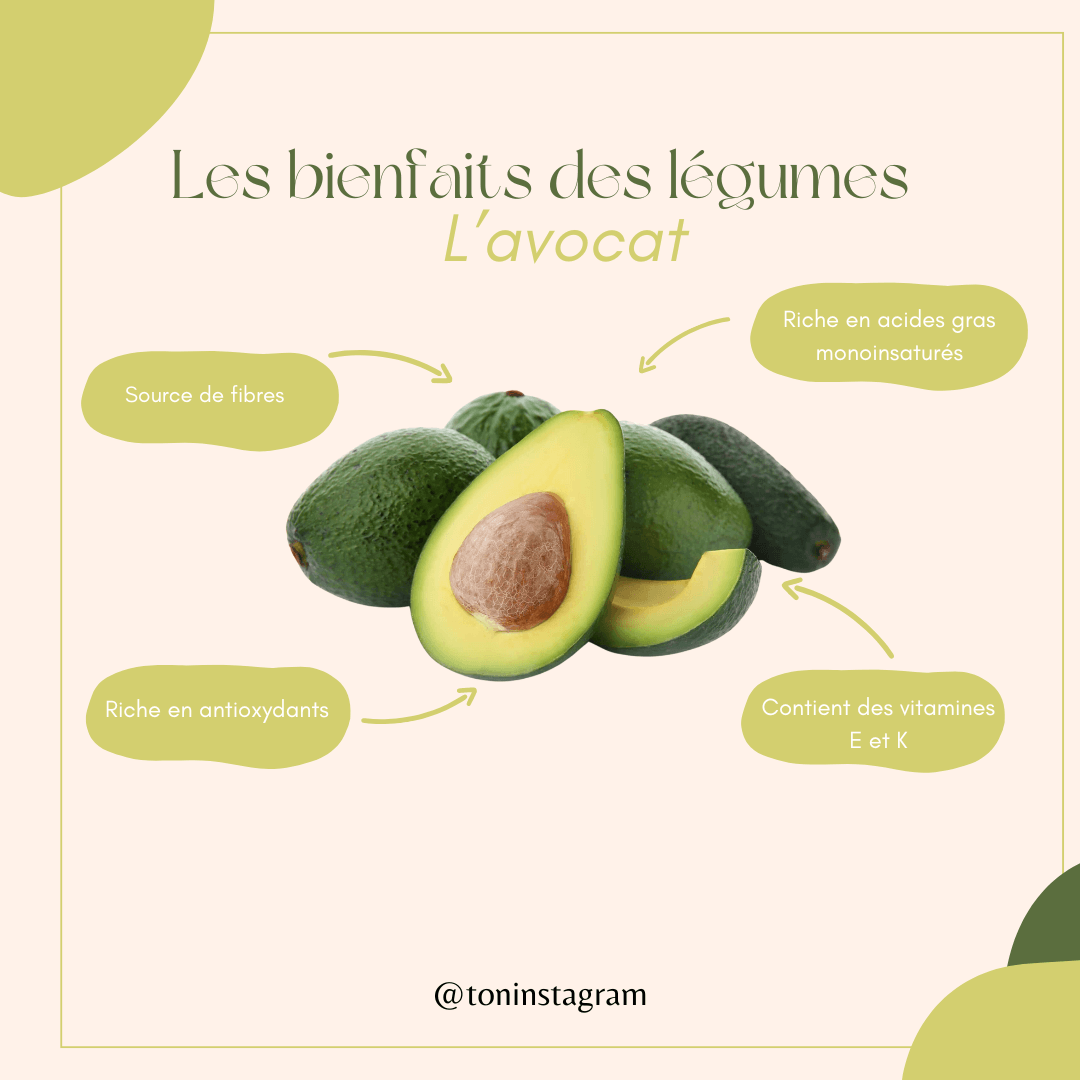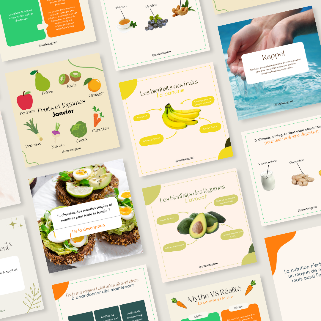 50 publications "Bienfaits Fruits & Légumes" : partage des informations claires sur les bienfaits nutritionnels de différents fruits et légumes pour sensibiliser ton audience à l’importance de consommer des produits frais.
