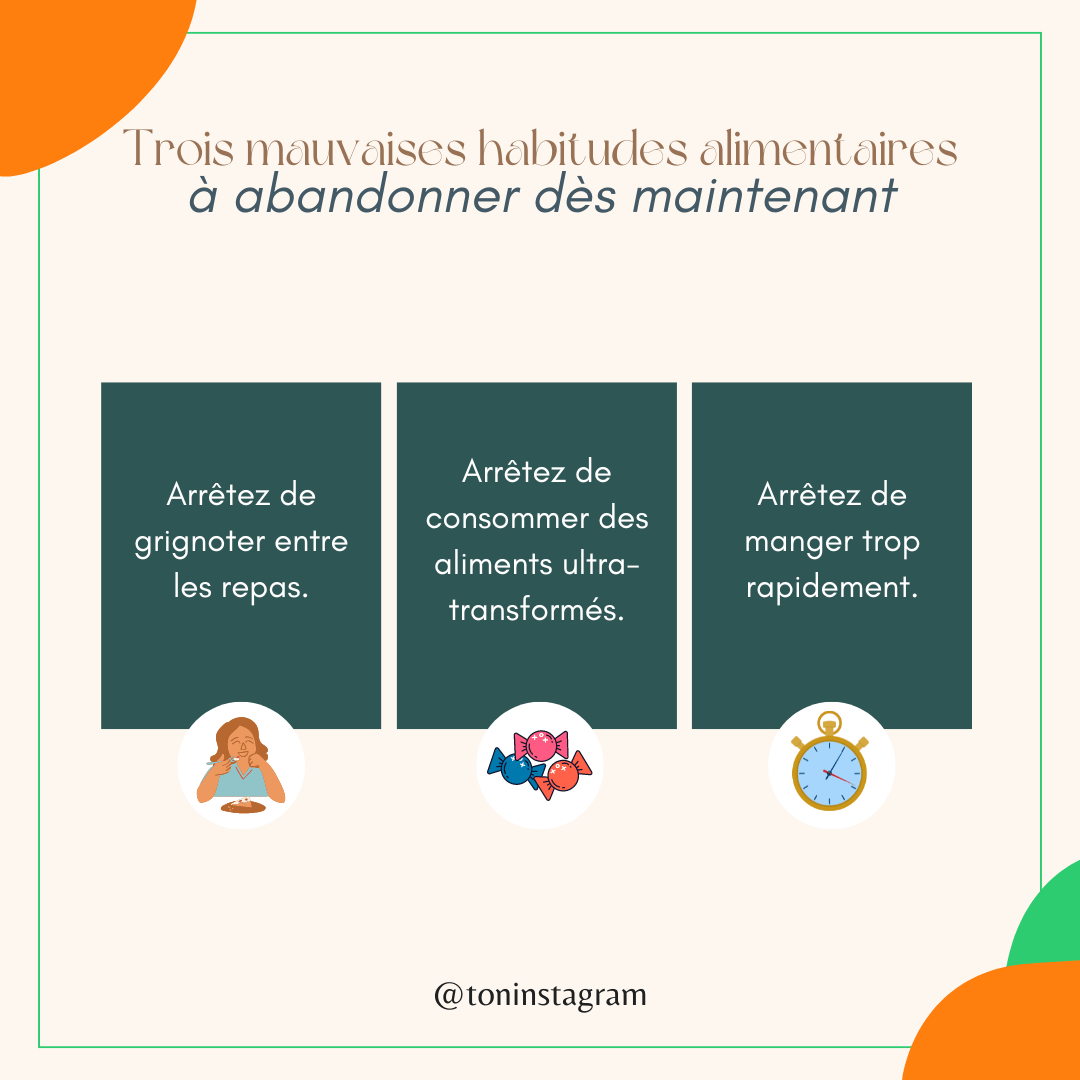 20 publications "Ce qu’il faut arrêter de faire…" : guide ton audience vers des habitudes plus saines en leur montrant les comportements alimentaires à éviter.