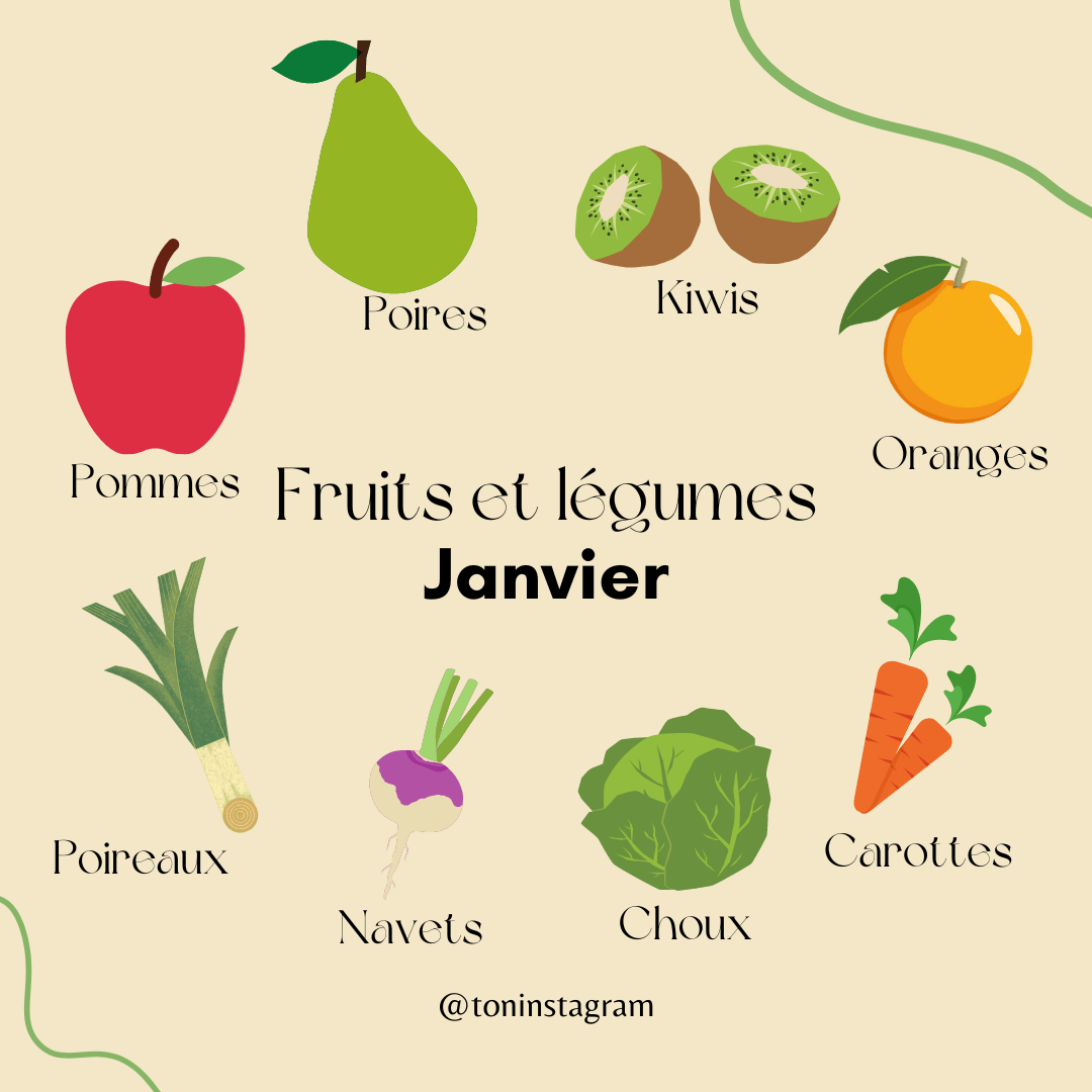 12 publications "Fruits et légumes de saison" : encourage la consommation de produits de saison en partageant des listes de fruits et légumes selon les périodes de l’année.