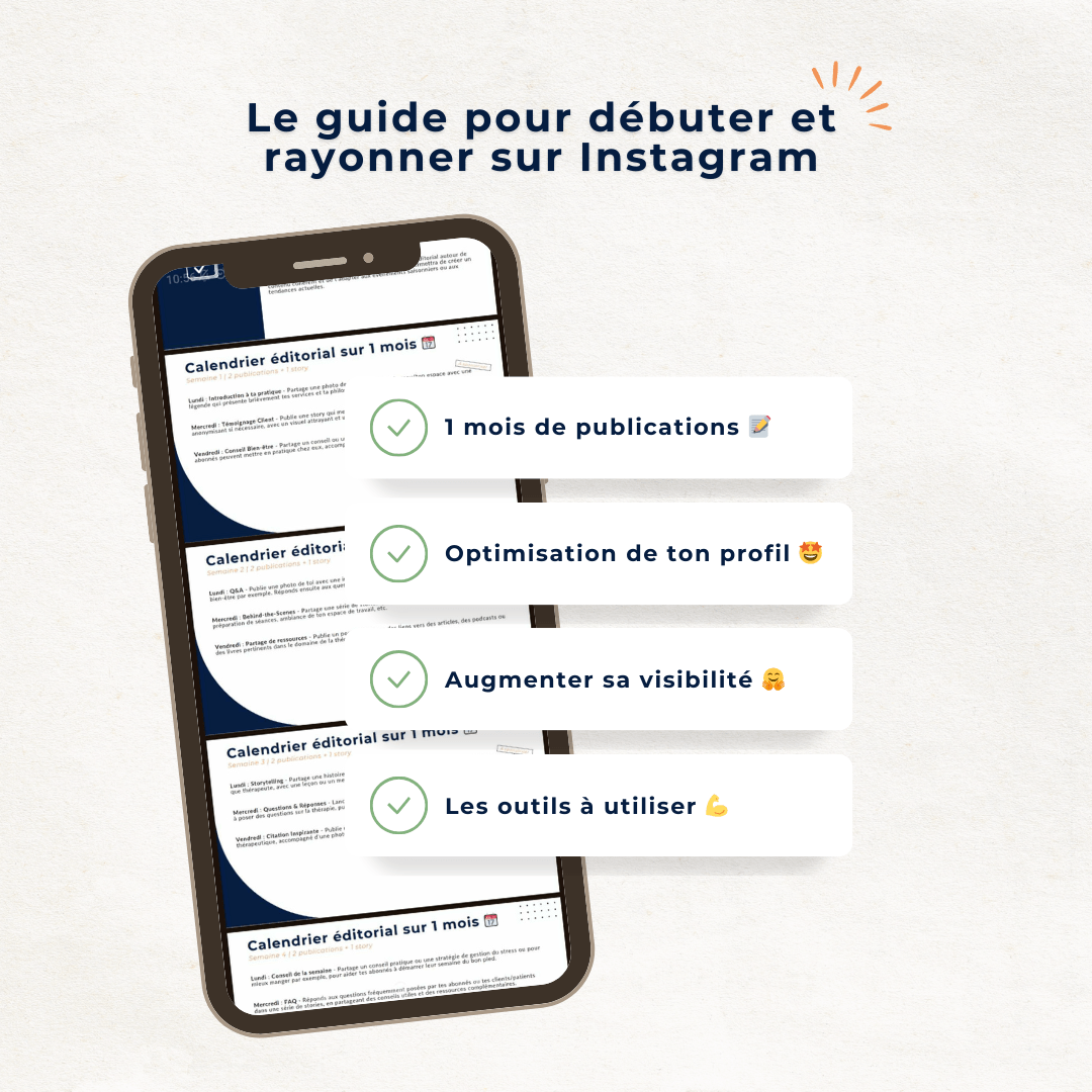 J’ai également inclus un guide complet pour rayonner sur Instagram. Dedans, tu trouveras tout ce dont tu as besoin pour optimiser ton profil, créer une stratégie de contenu engageante, et développer une communauté fidèle.