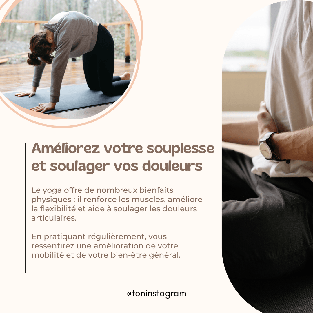💪 50 publications "Douleurs, souplesse et renforcement musculaire" : propose des routines et des postures adaptées pour améliorer la mobilité, soulager les douleurs chroniques et renforcer le dos.