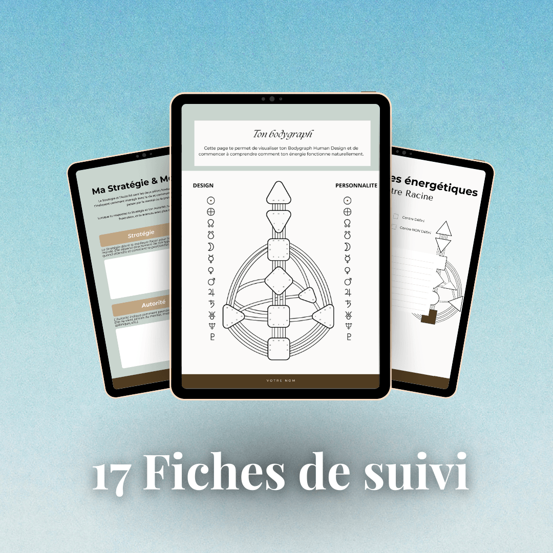 Tu trouveras 17 fiches 100% personnalisables pour accompagner tes clients. Bodygraph, centres énergétiques, portes définies, stratégie & autorité, c'est complet ! Il ne te restera plus qu'à personnaliser pour chacun de tes clients avec ses propres infos !